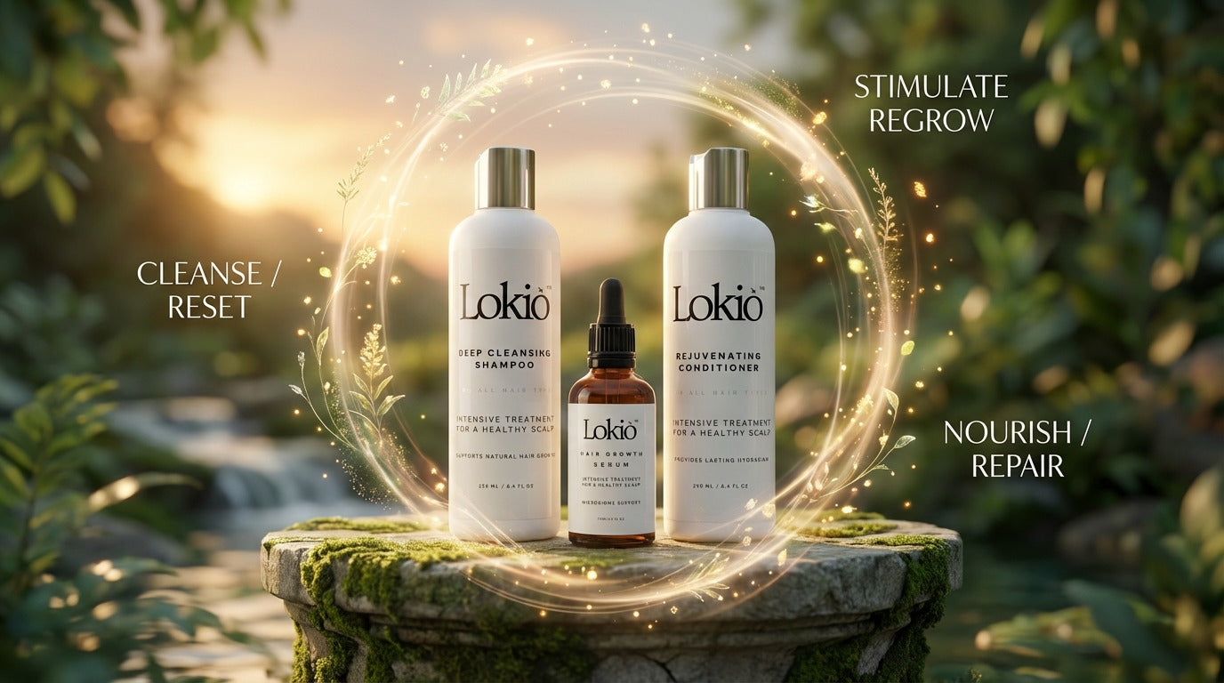 At Lokio, we combine time-tested botanical wisdom with modern formulation science. Our products feature carefully selected plant extracts like rosemary, nettle, and birch that have been used for centuries to promote scalp health and hair vitality.